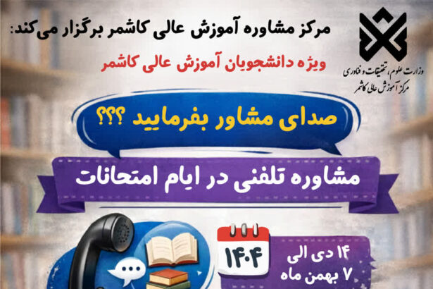 به اطلاع اساتید و دانشجویان عزیز میرساند؛ * براساس ابلاغیه جدید وزارت علوم، تحقیقات و فناوری و نظر به مصوبه کارگروه استانی آموزش عالی استان خراسان رضوی: امتحانات پایان نیمسال اول ۱۴۰۴ مقطع کارشناسی و کاردانی مرکز آموزش عالی کاشمر به صورت غیرحضوری (مجازی) برگزار خواهد شد. اطلاعیه تکمیلی در…